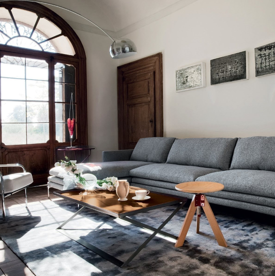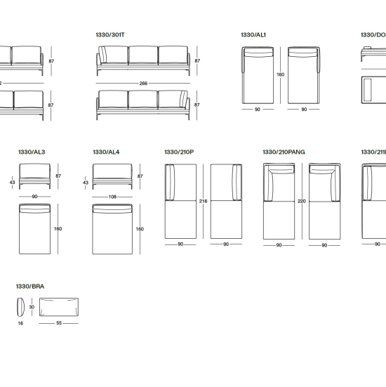 Le poltrone allungate senza bracciolo e i divani terminali sono predisposti per l’attacco di una mensola in legno massello di rovere verniciato colore naturale o tinto grigio oppure in noce canaletto verniciato colore binocolo naturale.